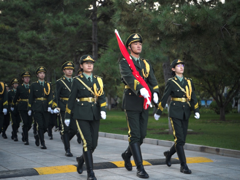 迎着破晓的晨光,国旗班队员步伐铿锵,在全体师生的庄严注目下,护卫五星红旗进场。伴随着《义勇军进行曲》,五星红旗在晨光中冉冉升起。